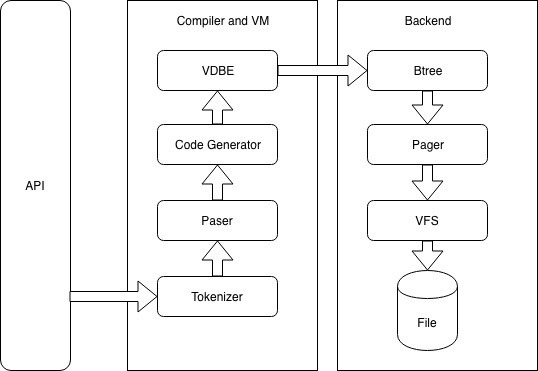 SQLite는 Core와 Backend로 구성이 되어있다. Core는 Interface, Tokenizer, Parser, Code generator, VM을 포함하고 있으며, Backend는 B-Tree, Pager, 파일 시스템에 접근하는 OS Interface를 포함하고 있다. Tokenizer, Parser, Code generator를 VM에 코드를 돌리기 위한 Compiler로 칭하고 있다.