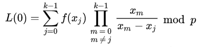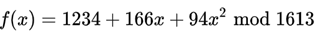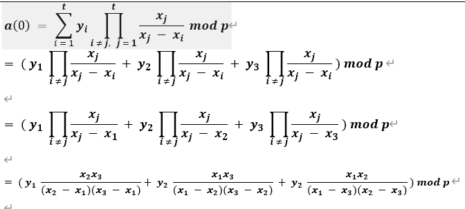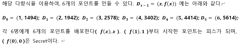 공유 비밀의 값이 1234일 때 우리는 아래와 같은 SSS 공식을 사용하여, 비밀 조각을 생성할 수 있다. [공유 비밀 생성] ![]() ![]() [비밀 재구성 – 1(basic)] ![]()