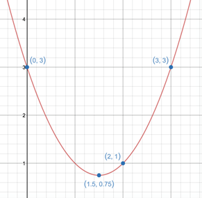 A는 위의 그림과 같은 공식(y = x^2 -3x + 3, 이차 함수 그래프)으로 비밀번호를 생성하였다.