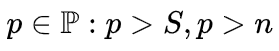 모듈러 연산에 사용하는 소수 값의 조건은 아래와 같다. 아래의 조건을 설명하면 다음과 같다. P 즉, prime(소수) p는 n(공유 조각들)보다 크고, S(비밀값)보다 크다. 는 prime의 집합이다. p는 그냥 소수라는 의미이다.