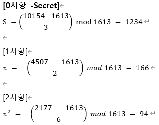 ![]() 설명 1. 유리수의 modulo 연산의 경우, 정수가 될 때까지 + 또는 – 연산을 통해 정수로 변경한다. 그 후, modulo 연산을 진행한다. 2. 음수의 modulo 연산의 경우, 일반 양수 mod 연산 후, 음수로 변경한 후, m을 더한다(예: -22 mod 5, 22 mod 5는 2이다. -2 + 5 = 3. 즉, -22 mod 5는 3이다. [비밀 재구성 – 2(optimized)] 공유를 재구성할 때 아래의 식을 적용한다(j, m의 index가 0부터 시작할 때). ![]() 식의 풀이는 다음과 같다(i, j의 index가 1부터 시작할 때) ![]() 위의 식이 최적화 식인 이유는 아래와 같이 필요한 지수에 대해서만 연산을 하기 때문이다(우리가 알고 싶은 것은 0차항 즉, Secret 값이다.). 즉, 1234 + 166x + 94x^2의 값 중에 필요없는 166과 94는 연산에서 제외하고, 비밀 값 1234만 연산한다. ![]() [대입] ![]() 위의 식이 최적화 식인 이유는 아래와 같이 필요한 지수에 대해서만 연산을 하기 때문이다(우리가 알고 싶은 것은 0차항 즉, Secret 값이다.). 즉, 1234 + 166x + 94x^2의 값 중에 필요없는 166과 94는 연산에서 제외하고, 비밀 값 1234만 연산한다.