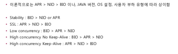 - Tomcat은 네트워크 통신에 대해 3개의 옵션을 제공한다. BIO, NIO, APR 3가지이다.
