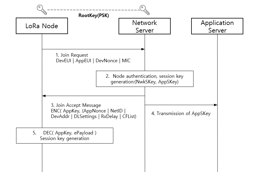OTAA은 DevEUI, AppEUI, AppKey를 기기에 주입 후, 기기 최초 개통 또는 초기화를 할 때 Join 과정을 진행한다. Join 과정은 다음 [그림 2]와 같다.