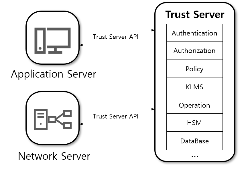 신뢰 서버는 암호키의 관리, 유지, 배포, 갱신 및 폐기 등의 암호키 사이클 관리를 한다. NS와 AS는 신뢰 서버 API를 통해 값의 암/복호화를 진행하며, 암호키의 관리는 신뢰 서버에 위임을 한다.