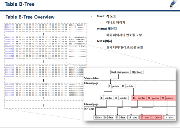 - BTree: 보통의 RDBMS의 경우, Index를 처리할 때 BTree를 사용한다. SQLite의 경우, 인덱스 뿐만 아니라, 데이터들 또한 BTree구조로 저장을 한다. SQLite에서 데이터를 조회하는 방식은 보통의 RDBMS에서 BTree를 통해 스캔하는 방식과 유사하다.