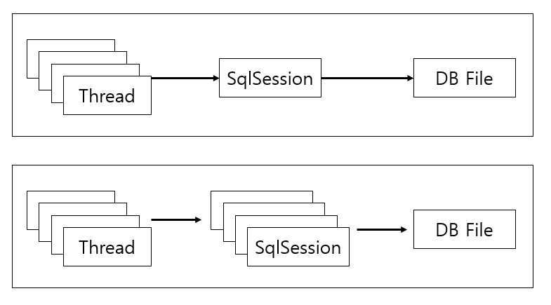- 맨처음은 파일 DB를 잘 몰라, Database Lock이 걸릴까봐, SqlSession 객체 인스턴스를 한개만 만들었다.